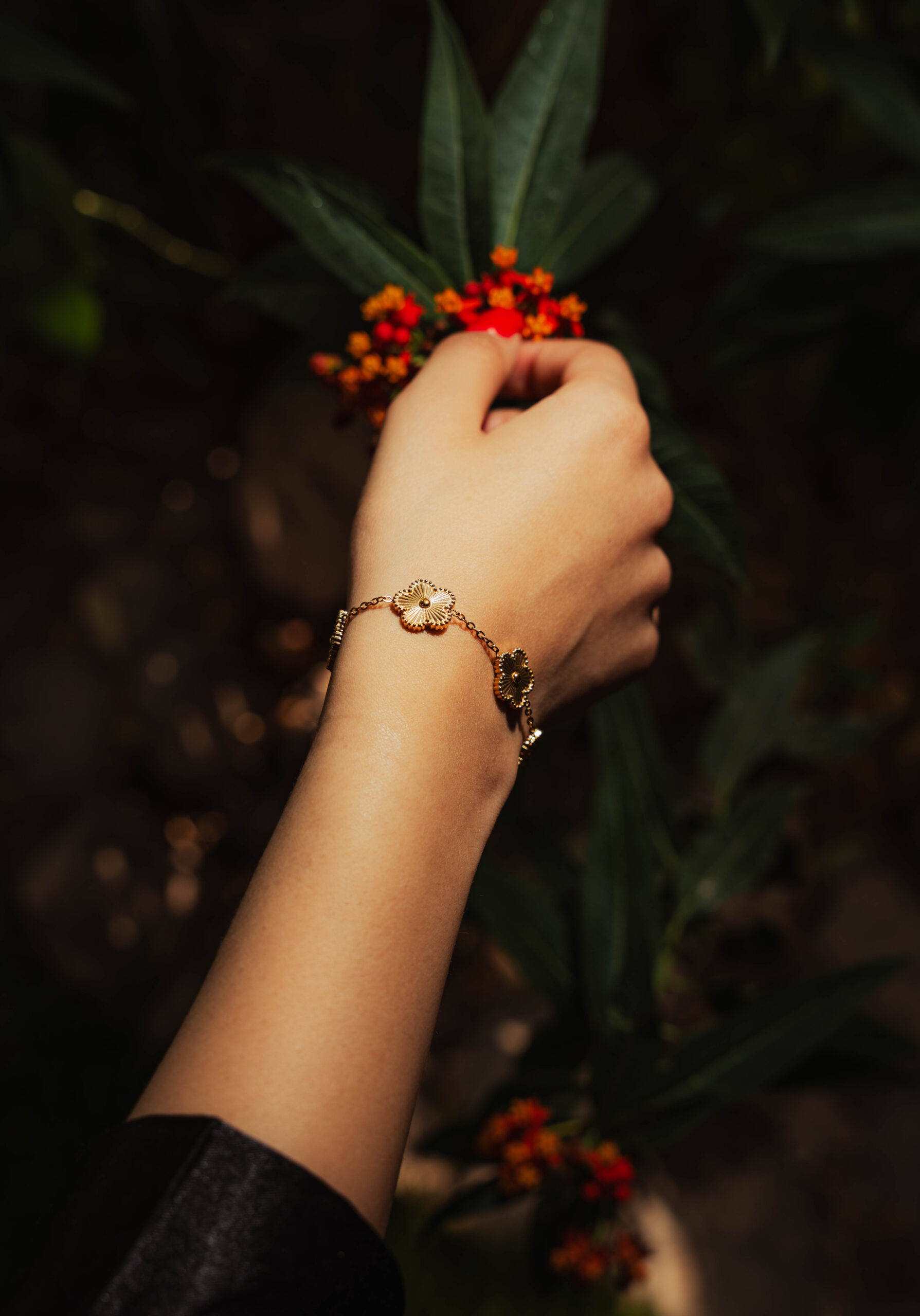 Pulsera con motivos de trébol de 4 hojas en acero inoxidable chapado en oro de 14 k.